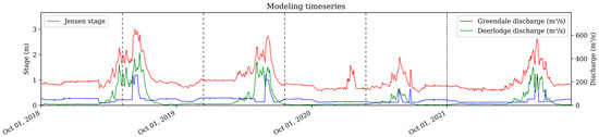 Daily averages for response (Jensen stage) and explanatory timeseries (Greendale and Deerlodge discharge) over the four water years used for modeling. The test split is shown as a dotted line at the start of the 2022 water year (1 October 2021). The cross-validation splits are shown as lighter dotted lines throughout the preceding three water years.