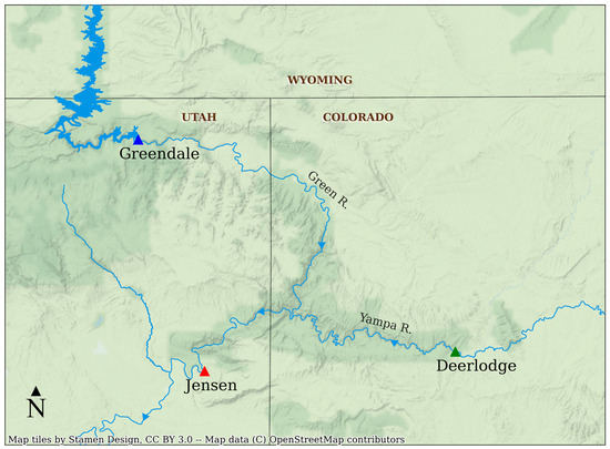 Stream gage information is accessed via the National Water Information System using the instantaneous value data retrieval REST API [28]. The USGS uses a station number to categorize sites from which hydrological data are measured, included here as “USGS 0#######”. Flaming Gorge Dam release is approximated by the Green River near Greendale, UT stream gage (USGS 09234500); Yampa River by the gage at Deerlodge Park, UT (USGS 09260050); and Jensen by the Green River near Jensen, UT stream gage (USGS 09261000).