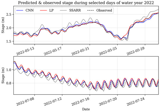 Hourly prediction and gage measurements for Jensen stage during selected periods of water year 2022 (top: 9–30 May 2022; bottom: 4–25 July 2022).