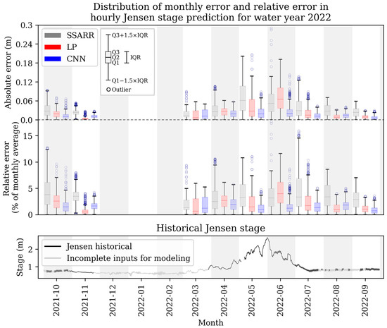 Monthly distributions of hourly errors for each model (SSARR, LP, and CNN) over the test water year. Absolute error and relative error are shown. Relative error normalizes error magnitudes by discharge magnitude and is calculated as absolute error divided by the monthly average stage. Boxes extend from the first quartile (Q1) of error to the third quartile (Q3) of error with error medians (Q2) shown as divider line. The interquartile range (IQR) is defined as Q3−Q1. Whiskers show the 1.5 × IQR deviation from the first and third quartiles. Errors outside the 1.5 × IQR are shown as circles and may be considered outliers. The Jensen stage hydrograph, plotted below monthly error distributions, shows how flow varies throughout the year. During times throughout the water year (indicated by a gray Jensen stage hydrograph), full modeling inputs are not available for either SSARR, LP, or CNN due to sampling resolution or otherwise incomplete records.