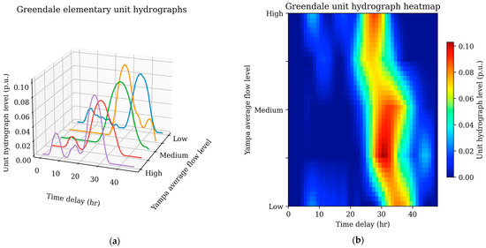 As seen in Equations (5) and (6), the presented formulation does not assume the unit hydrograph of a given reach to be static. Instead, the formulation assumes that the water flow component of reach is an evolving linear combination of subcomponents that are each associated to a static unit hydrograph . Mathematically, we can write: