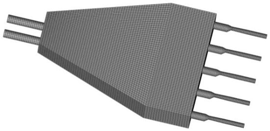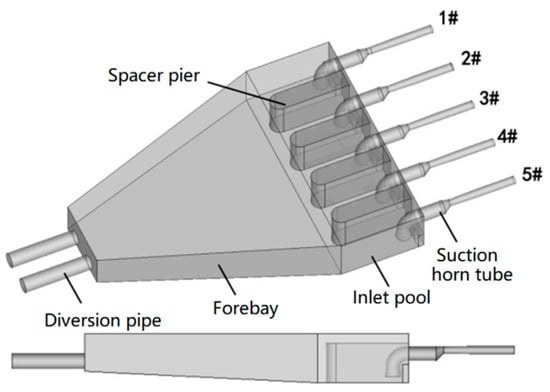 This study examines a large pumping station with five units, which are symmetrically arranged (4 working and 1 standby). The design flow rate of a single machine is 3.75 m3/s. The forebay of the pumping station is 38.38 m long and is diverted by two steel pipes with a diameter of 2.6 m. The slope of the pool bottom is 0.049, the divergence angle of the forebay is 39.02°, and the inlet pool is 15 m long and 39.2 m wide. The center distance between two adjacent pumps is 8.5 m, and the design water level is 19.5 m. The diameter of the trumpet tube is D = 2.6 m, the suspended height is 0.4 D, and the rear wall distance is 0.08 D. From top to bottom, these are units 1–5. The 3D model of the pumping station is shown in Figure 1.