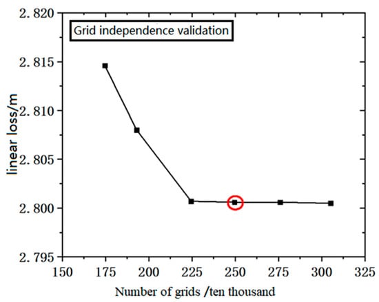 Accurate numerical simulation results are obtained by verifying the calculation domain for grid independence. A total of six sets of grid schemes with different densities are generated, with the number of grids ranging from 1.76–3.05 million. The calculation results are shown in Figure 3.