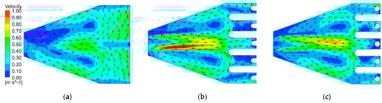 For further analysis of the internal flow of the inflow field of the pumping station, three sections were cut along the height direction of the forebay (the heights are: bottom layer z = 13.5 m, middle layer z = 16.5 m, surface layer z = 19.5 m). The flow velocity vector diagrams of the three sections are shown in Figure 5. As the position moves down, the range of unfavorable flow patterns such as backflow and vortex expands and even goes deep into the pier of the inlet pool.