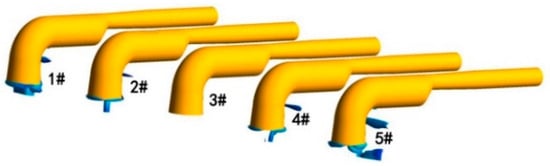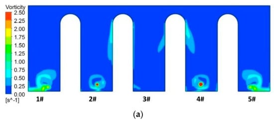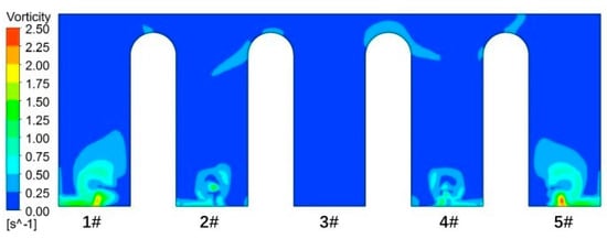 Figure 6 shows the vorticity diagram of the bottom surface of the water inlet pool of the original scheme, and Figure 7 shows the vortex structure diagram under the water suction horn tube of each operating unit. Vortices of different scales form near and below the water-absorbing horns of each operating unit and at the head of the pier. The bottom vortex is clearly shown in Figure 7. The pier is formed by the impact of water flow, and the attached bottom vortices under the water-absorbing horns of units 1 and 5 are relatively strong.