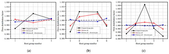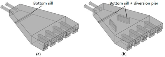 The principle of bottom sill rectification is to use appropriate engineering measures to cause the façade behind the sill to swirl, disrupt the plane backflow, and then use the diversion function of the diversion pier to homogenize the incoming flow. Thus, bad flow patterns such as backflow and vortexing are effectively eliminated. Based on the original design, this study proposes two rectification schemes, as shown in Table 2 and Figure 8.