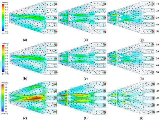 Velocity vector diagram of horizontal section (z = 13.5 m) of forebay and pump sump under different operating conditions: (a) Condition 1; (b) condition 2; (c) condition 3; (d) condition 4; (e) condition 5; (f) condition 6; (g) condition 7; (h) condition 8; (i) condition 9.