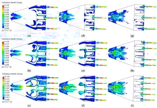 Vorticity diagram of horizontal section of front pool and inlet pool under different operating conditions: (a) Condition 1; (b) condition 2; (c) condition 3; (d) condition 4; (e) condition 5; (f) condition 6; (g) condition 7; (h) condition 8; (i) condition 9.