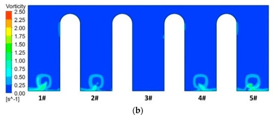 Figure 11 shows the vorticity diagram of the bottom surface of the inlet pool after the addition of rectification facilities when four units are turned on. By comparison with Figure 6, after the addition of rectification facilities, the range of vortex attached to the bottom of the operating unit decreases, but the single bottom sill increases the local (Nos. 2, 4 units) water flow vortices; and the addition of “bottom sill + diversion pier” in the forebay effectively improves the inflow conditions of the pump unit.