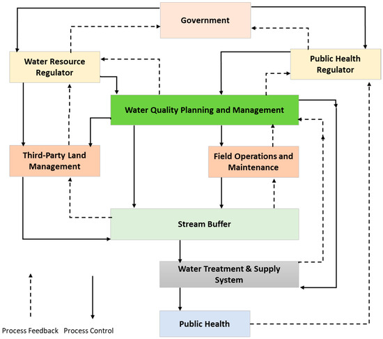 In the drinking water supply system scenario created for this study, the water quality is under the control of the WSP, which is accountable for the final supply to the customer. Included in the safety structure is the role of the government agencies responsible for the management of water resources. Also considered in the safety structure is the role of the public health authority, which has statutory responsibility for regulating drinking water supplies. While, as a regulator, there is no direct responsibility for managing stream buffers, there is indirect influence through regulatory actions. Including enabling actors in the safety control structure provides a detailed view of the broader sociotechnical structure that influences the successful management of ecosystem services in drinking water catchments.
