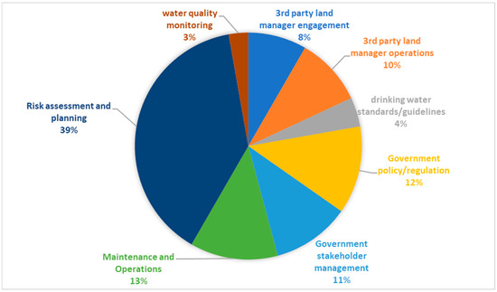 Of all the early warning signs identified, the majority related to the risk assessment and planning process, accounting for 39% of all indicators. These processes may be specific to stream buffers as well as catchment management in general. The risk review and planning processes set the foundations for the overall management system [39]. Issues are identified and found, and this stage can prevent possible degradation due to management actions. The next highest number of early warning signs can be found with maintenance and operation functions (13%) and government policy and regulation (12%). Like any other asset in the water supply system, stream buffers require ongoing, careful maintenance and operations to support the expected performance requirements [40]. In this instance, monitoring the early warning signals related to operations and maintenance functions provides greater certainty in meeting the water quality objectives. As for government policy and regulation, while not directly influenced by a WSP, it is important to be able to navigate the aspects of policy and regulation that influence stream buffer management. The smallest group of early signs related to water quality sampling accounted for only 3% of all indicators. Water quality sampling is often used as the principal indicator for the effectiveness of water quality interventions [41]. While adequate for characterizing water quality, monitoring is a lag indicator in this instance, as stream buffers may become seriously degraded before any change in water quality results is observed.