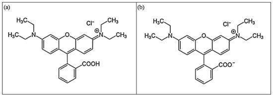 It is a basic synthetic cationic dye classified as a xanthene due to its chromophore group [7]. This dye has a color index classified as basic violet 10, a molar mass of 479.02 g mol−1, a wavelength between 547 and 555 nm for the absorption of electromagnetic radiation, a solubility in water of approximately 50.0 g L−1, and a pKa value of 3.7 at 20.0 °C. RB can be used in acid and/or moderately acid baths due to the presence of a carboxyl group in its molecule and due to its zwitterionic structure [9,15]. The uses of RB include the dyeing of cotton, wool, silk, leather, paper, and bamboo. RB is also widely used as a biological stain in biomedical research labs due to its analytical and photochemical applications [16]. Although its zwitterionic form is neutral, it is generally considered to have a local charge due to the presence of ionizable groups [15]. RB is considered to be carcinogenic, genotoxic, and neurotoxic and causes harm to humans due to its interaction with cellular DNA, forming intermolecular hydrogen bonds that alter the physiological functions of cells [17,18]. However, RB is important for the monitoring of environmental pollution by pesticides because it is added to pesticide compositions to enhance the stability of these agricultural products [19].