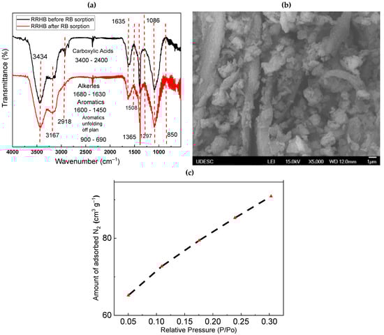 FTIR spectra for the RRHB before and after the sorption process of RB (a), SEM image at magnification of 5000 times (b), and BET surface area related to sorption of nitrogen gas on/in biochar (c).