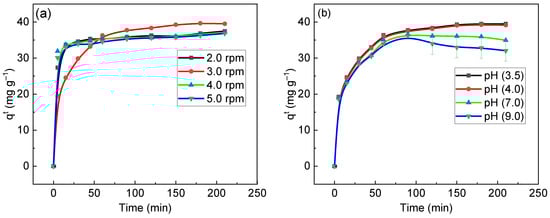 Effect of stirring of solution (a) with initial concentration of 4.0 mg L−1, pH 4.0, temperature of 22.0 °C, and sorbent mass of 0.10 g. Effect of pH (b) with initial concentration of 4.0 mg L−1, temperature of 22.0 °C, sorbent mass of 0.10, and stirring at 5.0 rpm.