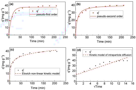 One of the objectives of sorption kinetics studies is to understand how resistance to mass transfer occurs between sorbents and sorbates [32]. The results of the nonlinear pseudo-first-order, pseudo-second-order, and Elovich kinetic models and the results of the intraparticle diffusion model are presented in Figure 6a–d, respectively, and in Table 1.