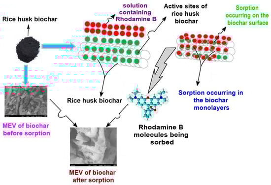 In this work, raw rice husk biochar (RRHB) was investigated for its potential as a valuable industrial byproduct for the decontamination of water using rhodamine B (RB) as a model pollutant. Specific functional chemical groups that were identified in the structure of the biochar using Fourier transform infrared (FTIR) spectra were determined to be responsible for the interaction between the biochar and the pollutant, explaining the sorption process. The interaction between the pollutant and biochar was also explained by the porosity of the sorbent, as demonstrated by scanning electron microscopy (SEM), and the specific surface area (Brunauer–Emmett–Teller analysis, BET). The ionic charge of the biochar structure was determined based on the point of zero charge (pHPCZ). The best kinetic fit for the sorption of the dye on/in the biochar was obtained with the nonlinear pseudo-second-order and Elovich models. The nonlinear Freundlich isotherm had the best fit to the experimental data, and it was determined that the maximum sorption capacity was ~40 mg g−1. The thermodynamic parameters indicated that the sorption of the RB on/in the RRHB was spontaneous. Overall, RRHB was demonstrated to be a potential biosorbent for cationic dyes such as RB. Finally, it is possible to recover the biosorbent, aggregating value to the byproduct and showing it to be an excellent option for use in water purification filters.