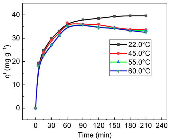 Figure 8 displays the thermodynamic results of the RB sorption on/in the biochar as a function of time and temperature. Table 3 displays the variations in the Gibbs free energy (ΔG°s), sorption enthalpy (ΔH°s), and sorption entropy (ΔS°s).