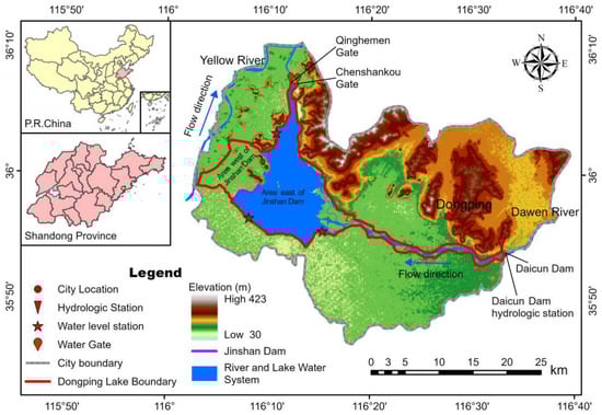 Dongping Lake (116°1′–116°34′ E, 35°43′–36°8′ N) is situated on the right bank at the confluence of the transitional and meandering sections of the lower Yellow River [], adjacent to the alluvial plain of the lower Yellow River and the Dawen River (Figure 1). The lake is located in Dongping County, Shandong Province, China, and the lake’s main function is to store and regulate floodwaters from the Dawen River. Floodwaters from the Dawen River reach this lake after traveling through an inlet channel of approximately 30 km in length from the Daicun Dam. Excess floodwaters are discharged into the main stream of the Yellow River through the Chenshankou Gate and the Qinghemen Gate, with both gates having a maximum designed discharge capacity of 2500 m3/s. Additionally, the river section downstream of the Daicun Dam in the Dawen River, approximately 30 km in length, is characterized by a very small slope (measured at 0.07‰ in 2021) and is considered part of Dongping Lake, as it has become the backwater area of the lake. Under normal conditions, floodwater from the Dawen River enters the Dongping Lake and is discharged into the Yellow River through the Chenshankou Gate and the Qinghemen Gate. But elevated Yellow River water levels can cause a backwater effect, affecting outflow and impeding the operation of this lake. Therefore, a thorough investigation of the impact of the Yellow River water backwater effect on the operation of the Lake is of utmost importance.