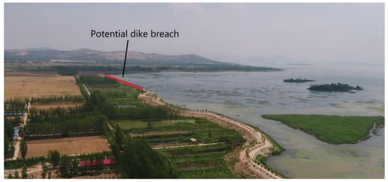 The designed flood control water level for Dongping Lake is 44.72 m (China 1985 National Height Datum). Correspondingly, the storage capacity is 12.28 × 108 m3. After the 1960s, the local residents spontaneously constructed a 5.4 km-long dam (referred to as Jinshan Dam) in Dongping Lake for land reclamation (Figure 2). Eventually, after comprehensive considerations by the local government, Jinshan Dam was retained. Meanwhile, to ensure the safety of the residents living west of Jinshan Dam, risk removal and reinforcement measures were implemented for Jinshan Dam, setting the dam crest elevation at 43.72 m. Additionally, a 300 m-long section on the dam was reserved for controlled blasting to cope with excessive floodwaters that cannot be accommodated in the eastern area of Jinshan Dam. Due to the existence of the Jinshan Dam, Dongping Lake has effectively entered a tiered utilization status. According to the flood control contingency plan, when the water level of Dongping Lake exceeds 43.22 m, the area west of Jinshan Dam will be considered for use.