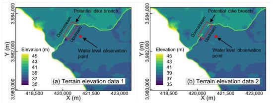 - If the water level at the observation point meets or exceeds the breach water level, update the topographical data to the second set of data (Figure 3). Moreover, to ensure the smooth flow of water through the breach and downstream, this updating process is scheduled before the grid wet-dry determination step.
