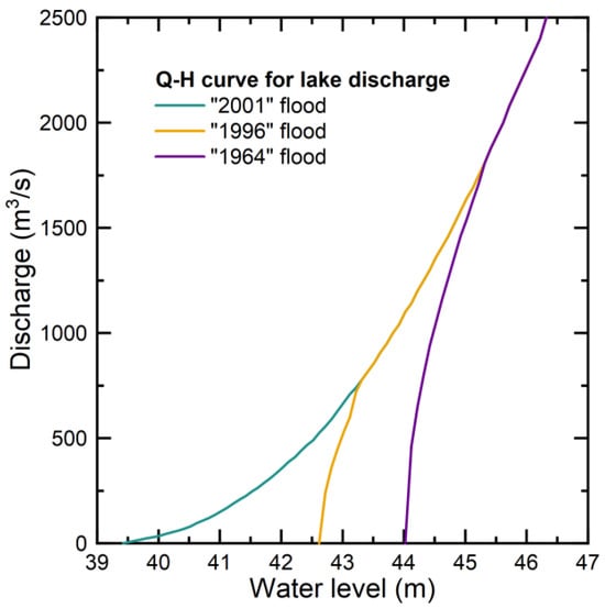 To investigate the impact of the Yellow River backwater effect on the operation of Dongping Lake, three different degrees of influence are designed: non-backwater effect, moderate backwater effect, and severe backwater effect for Dongping Lake outflow. These effects were based on three typical years of Yellow River flood conditions, as reported by Yang et al. []. These specific years of flood include the “2001 flood”, “1996 flood”, and “1964 flood”, each resulting in no, moderate and severe impact on the outflow discharge of Dongping Lake. For this study, we obtained the relationship curves between the lake water level and outflow discharge for Chenshankou Gate and Qinghemen Gate when both gates are fully open, corresponding to the three aforementioned levels of flood influence. These curves are shown in Figure 4. As the Yellow River has the highest sediment concentration among the world’s rivers, its strong erosion and sedimentation changes result in rapid fluctuations in water level and discharge behind the gates []. Therefore, the lake water level and outflow discharge relationship curves need frequent calibration. The data used in this study was calibrated in June 2023.