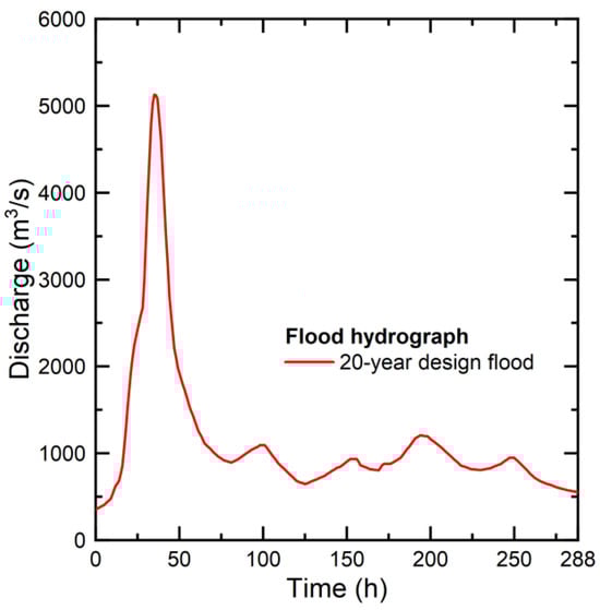 In addition, the flood control capacity of Dongping Lake is designed to accommodate a Dawen River inflow corresponding to a 20-year design flood. To control for a single variable, the inflow condition of the Dawen River is set to the 20-year design flood. The 20-year design flood hydrograph is in Figure 5. The flood duration is 288 h, with a peak discharge of 5130 m3/s and a total flood volume of 11.88 × 108 m3. The data presented in Figure 4 and Figure 5 were provided by the Shandong Yellow River Water Conservancy Bureau Dongping Lake Management Bureau. The specific working conditions are shown in Table 1.