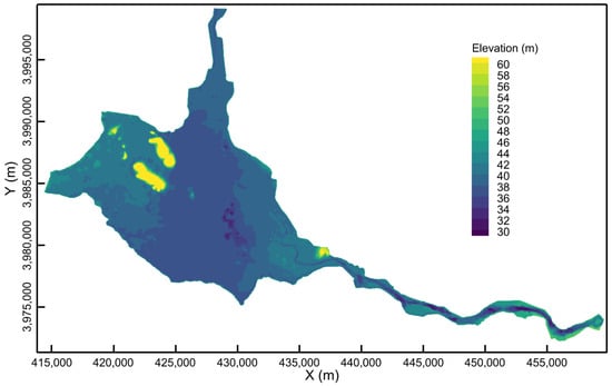 The Digital Elevation Model (DEM) data used in this study for Dongping Lake is provided by the Yellow River Conservancy Commission, with a resolution of 5 m, measured in June 2021 (Figure 6). Since 2021, the area west of Jinshan Dam has never been submerged, and the relatively low sediment concentration of the Dawen River (average sediment concentration of 0.92 kg/m3) results in minimal changes in the lake bed east of Jinshan Dam. Therefore, it is reasonable to assume that this DEM data does not significantly differ from the most recent data and can be used for this study.