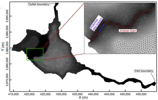 The entire study area is partitioned into 107,223 computational elements using a triangular unstructured mesh. The central computational elements in Dongping Lake have an average area of approximately 4800 m2, while the computational elements in the sections downstream of Daicun Dam, the area west of Jinshan Dam, and the outflow channel have an average area of approximately 550 m2. Specifically, to accurately depict the shape and elevation of Jinshan Dam in the terrain, a higher-resolution mesh with an average element area of approximately 25 m2 is used in the vicinity of Jinshan Dam (Figure 7).