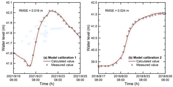 Two measured flood events at Daicun Dam hydrological station (Model calibration 1: “20210919” flood; Model calibration 2: “20180817” flood) were used to calibrate the established model. The terrain data and mesh division used in the model calibration were consistent with the previous introduction. The outlet boundary conditions for these two measured flood events were the measured outflow discharge at Chenshankou Gate and Qinghemen Gate during the corresponding periods. The model calibration was performed by comparing the calculated water levels in Dongping Lake with the measured values, and the measured values come from the average of three water level stations (in Figure 1). Through iterative adjustments, the final determination of the main parameter settings in the model is shown in Table 2. Figure 8 shows the calibration results for the two different flood events, demonstrating a high level of agreement between the calculated and measured values, the root mean square errors (RMSE) for Model Calibration 1 and Model Calibration 2 are 0.016 m and 0.024 m, respectively.