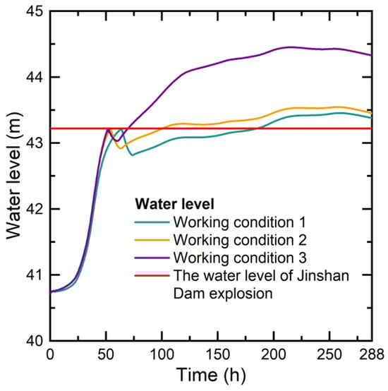 With the breach of Jinshan Dam, a large amount of floodwater was discharged to the area west of Jinshan Dam, causing the water level in Dongping Lake to decline to different extents, reaching 42.82 m, 42.92 m, and 43.03 m for working conditions 1, 2, and 3, respectively. The differences in water level decline are due to the variations in inflow and outflow. This stage lasts for approximately 8.0 h in all working conditions since the breach of the dam results in a consistent and substantial outflow, which dominates over inflow.