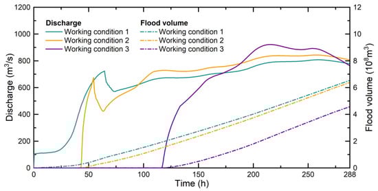 Outflow process and cumulative outflow volume hydrographs for every working condition. (The statistical values of outflow are the sum of the discharge from the Chenshankou Gate and the Qinghemen Gate).