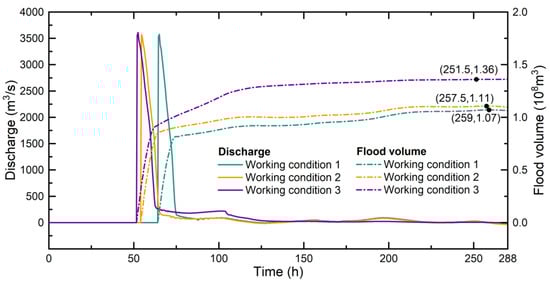 In addition to the outflow process, Figure 11 also presents the cumulative outflow volume hydrographs for the three working conditions. At 0.0 h, 43.0 h, and 116.5 h, the floodwater starts to be discharged to the mainstream of the Yellow River in working conditions 1, 2, and 3, respectively, with a total outflow volume of 6.54 × 108 m3, 6.39 × 108 m3, and 4.57 × 108 m3. Severe backwater effect conditions result in a more challenging outflow of floodwater. Compared to the working conditions without the backwater effect, the severe effect and moderate effect working conditions reduce the total outflow volume by 30.1% and 2.3%, respectively, and delay the commencement of outflow by 116.5 h and 43.0 h, respectively.