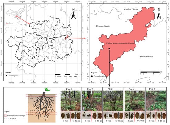 Guizhou Yuping Dong Autonomous County is located at 108°34′–109°09′ E and 27°28′–27°31′ N. Yuping County is adjacent to Xinhuang, Hunan Province, in the southeast, and it is adjacent to Zhenyuan and Cengong in the west and borders Tongren City and Wanshan Special District in the north, with an east–west distance of 36 km, a south–north distance of 42 km, and a total area of 523.78 km2. With a subtropical monsoon humid climate, Yuping County is free from the excessive cold of winter and intense heat of summer, and it has abundant rainfall, with heat and precipitation accumulating during the same period. In addition, the annual average relative humidity, annual precipitation, and annual sunlight hours are 79%, 1174.1 mm, and 1206.7 h, respectively. Yuping County is located in the transitional zone between the Yunnan-Guizhou Plateau to the hills in western Hunan and consists of flat lands between low mountains and hills, with a typical elevation of 400–600 m. The study area is located within the C. oleifera planting base in Yuping County in the transitional zone from the Yunnan-Guizhou Plateau to the hills of western Hunan (Figure 1).