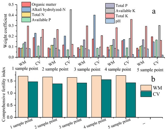Weighted average coefficients and the comprehensive soil fertility index in the five sample plots. Note: (a) weight coefficient, and (b) comprehensive soil fertility index.