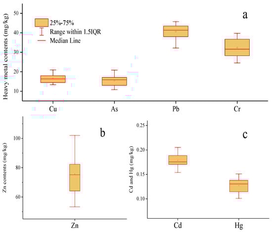 Boxplots of the heavy metal contents in the soil of the Qianyu C. oleifera base. Note: (a) Cu\As\Pb\Cr contents, (b) Zn content, and (c) Cd\Hg contents.