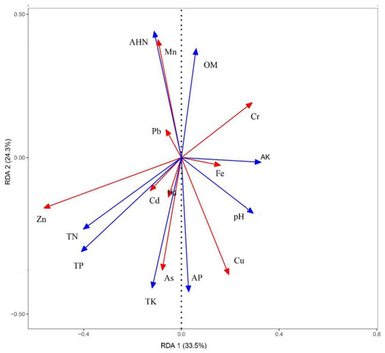 Based on the interpretation ratios of the first and second axes at 33.5% and 24.3%, respectively, the first two sequential axes of the 15 (soil plus trace elements) indicators explained 57.8% of the variation in the soil and the contents of the trace elements in the soil (Figure 4), which contained available information about the soil’s environment and the trace elements therein. This figure also presents the correlations between the following factors: the positive correlations for the soil organic matter with Pb, Mn, and Cr, and the negative correlations for the soil organic matter with Zn, Fe, Cd, Hg, As, and Cu.