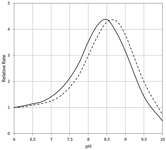 Modelled relative rate of the generation of hypobromate with pH at T = 20 °C (dashed line) and 40 °C (solid line), assuming the rate limiting step is the bimolecular reaction of HOBr with HOBr (relative k = 3) or HOBr with OBr− (relative k = 1).