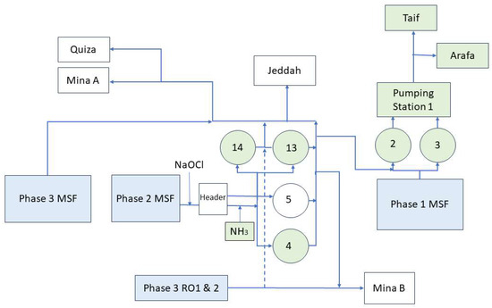 After chlorination and ammoniation, the treated water was passed on to tanks within the Shoaibah desalination plant complex, which also receive water from other sources, some of which produce low-TDS water with no significant bromate problems, while others are more problematic; these in turn proceed to pumping stations which draw upon multiple tanks.
