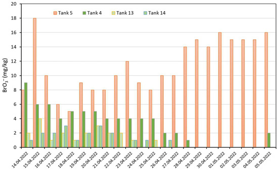 The day-by-day bromate data for the tanks containing untreated water (Tank 5) and primarily treated water (Tanks 4, 13, and 14) are displayed in Figure 3.