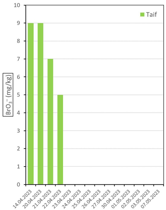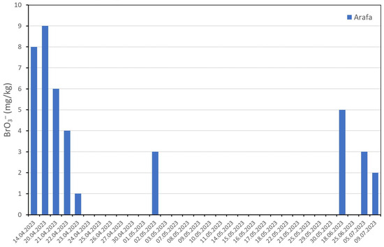 Bromate concentration in Arafa and Taif storage tanks during the 2023 trials.