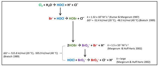 - Beckwith, R.C.; Margerum, D.W. Kinetics of hypobromous acid disproportionation. Inorg. Chem. 1997, 36, 3754–3760. [Google Scholar] [CrossRef]