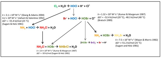 The net result of these reactions should be the sequestration of the initially present bromide as haloamines, predominantly as NHBrCl [33,36]. The net of reactions of the haloamines is summarized below (Scheme 3).