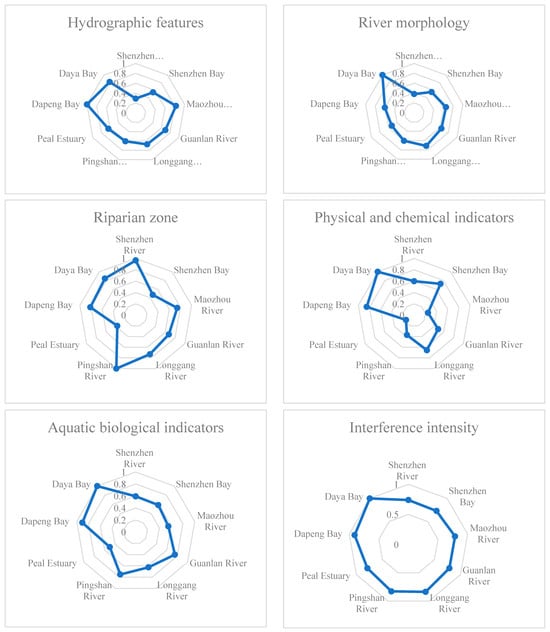 The average value of each criterion level index evaluation score of the nine major basins is normalized to the maximum value, and the analysis results are shown in Figure 2. In general, the assessment results of river hydrology, morphology, aquatic organisms, physical and chemical properties of the water body, and disturbance intensity of Daya Bay and Dapeng Bay basin, both in the east of Shenzhen, are obviously better than those of other basins. Specifically, the normalized scoring range of river hydrological criteria layer indicators is 0.29~1.00, with an average of 0.66. The relative score of the Dapeng Bay basin is the highest, and that of the Shenzhen River basin is the lowest. The normalized score range of the river form criterion layer index is 0.38~1.00, with an average of 0.63. The relative score of the Daya Bay basin is higher, while that of the Shenzhen River basin is the lowest. The normalized score range of the riparian zone criterion layer index is 0.38~1.00, with an average of 0.74. The relative score of the Pingshan River basin is the highest. The relative scores of the Pearl River Estuary and Shenzhen Bay are low. The normalized score range of indicators in the physical and chemical criteria layer of the water body is 0.16~1.00, with an average of 0.57. The relative score of the Daya Bay basin is the highest, the relative score of the Pearl River Estuary and the Maozhou River basin is low, and the water quality is generally poor. The normalized score range of interference intensity criterion level indicators is 0.73~1.00, with an average of 0.82. The relative score of the Daya Bay basin is the highest, the relative scores of Shenzhen Bay and the Shenzhen River Basin are relatively low, and the interference of human activities is relatively strong.