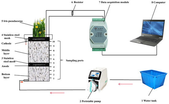 Three small-scale CW-MFC devices were built within cylindrical PVC barrels, each with a bottom diameter of 20 cm and a height of 45 cm. Gravel with a diameter of 4–6 mm is used as the bottom layer, and the thickness is 15 cm [54]. On top of this layer, a 5 cm layer of activated carbon particles (with a particle diameter of 2–3 mm) was placed to serve as the anode. A stainless steel mesh was incorporated within the activated carbon to form a stainless steel-activated carbon anode [53]. Above the anode, gravel with a thickness of 20 cm acts as the middle layer. Above the middle layer is the cathode with the same structure as the anode, and the surface of the cathode is exposed to the air. Iris pseudacorus was planted in the cathode area, with three plants in each reactor. Sampling ports were installed at 5 cm intervals along the side of the device, resulting in an effective volume of 3.56 L. The anode and cathode areas were connected via copper wires and connected in series with an external electrical resistor (1000 Ω) (Figure 1). A data acquisition module (DAM-3057, Art Technology Co. Ltd., Beijing, China) was employed for continuous voltage monitoring, with data acquisition occurring at 10-s intervals [55].