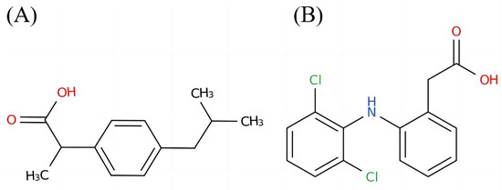 IBP and DCF (Figure 2), each at a concentration of 10 mg·L−1, were introduced into the simulated wastewater, and the HRT was set at 3 days. The systems operated continuously for 60 days. The target PPCPs, IBP, and DCF (all > 98% purity) used in this study were sourced from Aladdin (Shanghai, China). Properties of the target PPCPs can be found in Table S1.