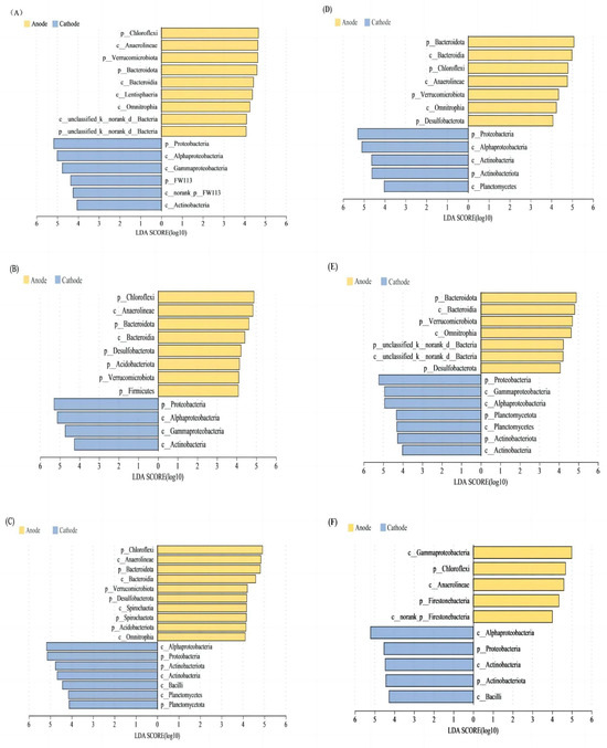 Indicator bacterial with LDA scores of 4 or greater in anodes and cathodes with different co-substrate combinations: (A) IBP-Glu, (B) IBP-Suc, (C) IBP-SA, (D) DCF-Glu, (E) DCF-Suc, (F) DCF-SA.