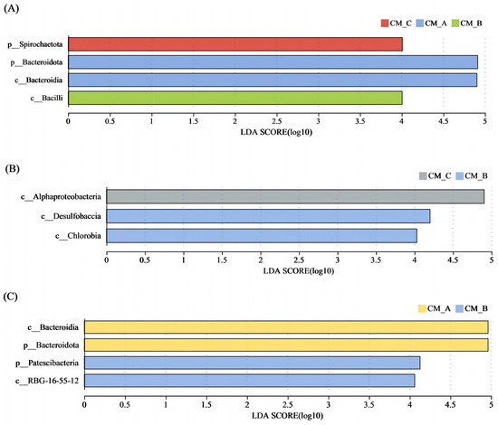 LEfSe analysis was employed to discriminate the indicator microbial communities at various taxonomic levels, ranging from domain to class in the cathodes and anodes of three CW-MFC devices (CM-A, CM-B, and CM-C) during the removal of IBP and DCF. The selection criteria were based on an LDA score exceeding 4. In the anode treated with IBP (Figure 4A), Bacteroidota (from phylum to class) is enriched in CM-A. CM-B displays an enrichment of the class Bacilli (within the phylum Firmicutes), while CM-C shows a high abundance of the phylum Spirochaetota. When removing DCF, in the cathode (Figure 4B), the class Alphaproteobacteria (within phylum Proteobacteria) is enriched in CM-C. CM-B demonstrates a higher abundance of the class Desulfobaccia (within the phylum Desulfobacterota) and the class Chlorobia (within the phylum Bacteroidota). In the anode (Figure 4C), Bacteroidota (from phylum to class) is enriched in CM-A. CM-B exhibits an enrichment of the class RBG-16-55-12 (within the phylum Actinobacteriota), and the phylum Patescibacteria is also enriched.