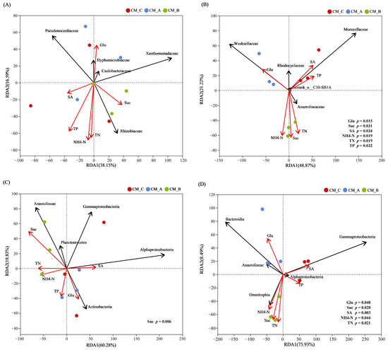 Redundancy analysis (RDA) between samples and environmental variables (Glu, Suc, SA, NH4+-N, TN, and TP). (A) Cathode treated with IBP; (B) Anode treated with IBP; (C) Cathode treated with DCF; (D) Anode treated with DCF.