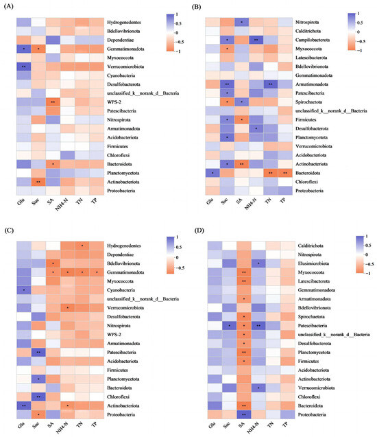 Correlation analysis of Glu, Suc, SA, NH4+-N, TN, and TP concentrations, as well as dominant bacteria in cathodes and anodes at the phylum level. Orange indicates negative correlations, while purple indicates positive correlations. The darker the color, the stronger the correlation (* p < 0.05, ** p < 0.01). (A) Cathode treated with IBP; (B) anode treated with IBP; (C) cathode treated with DCF; (D) anode treated with DCF.