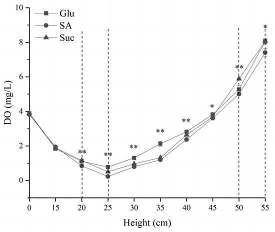 DO variation over height in CW-MFC. * indicate significant differences, with * p < 0.05, ** p < 0.01.
